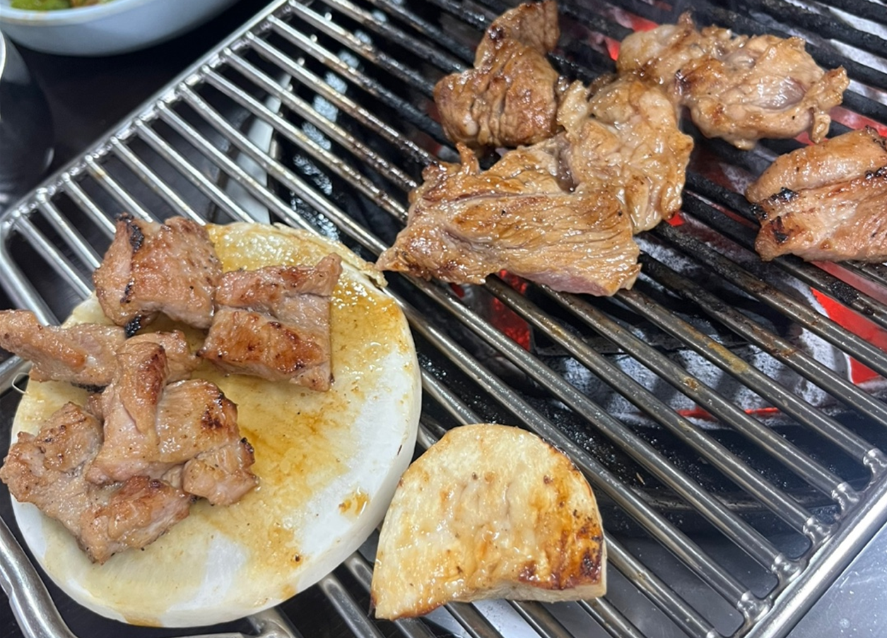 무 위에 고기를 올려주는 독특한 방식도 인상적이에요.