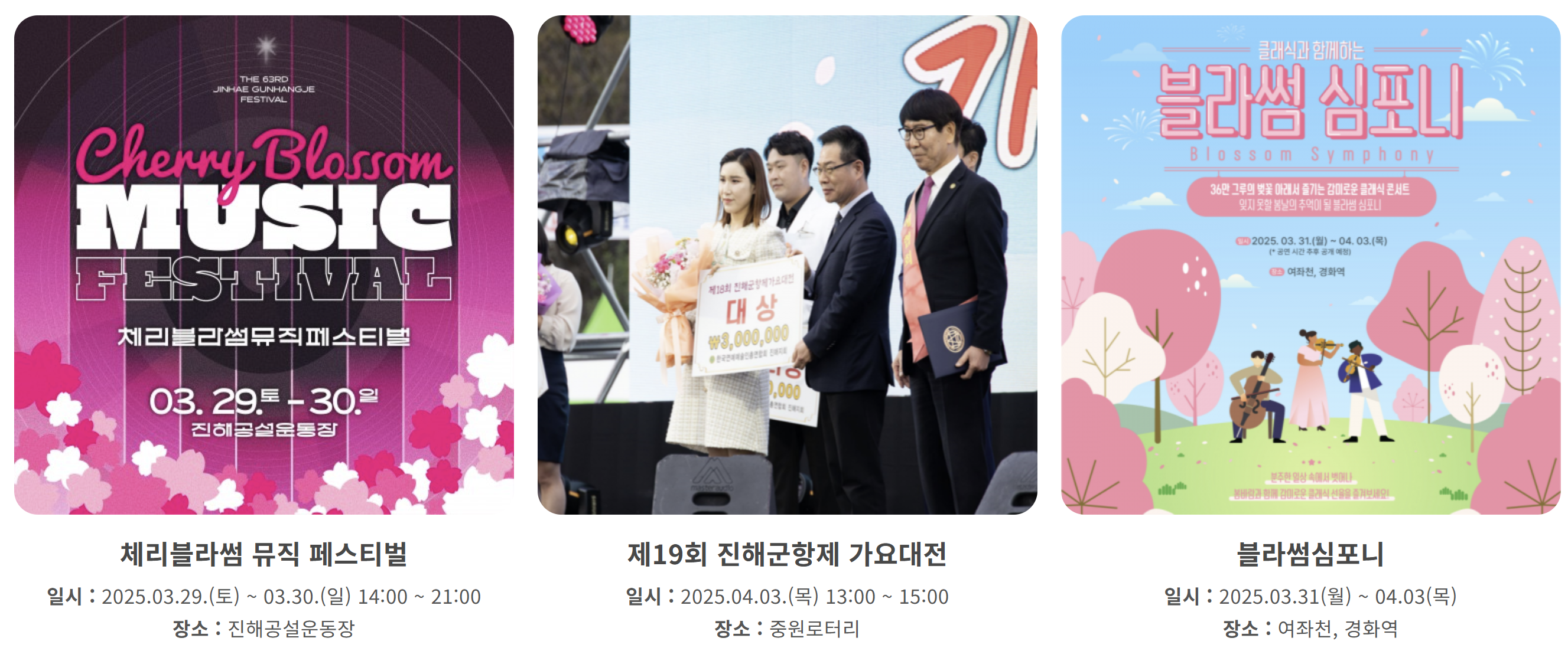 | 진해 군항제 가요대전 | 04.03 | 각 지역 대학,직장인,지역주민 대상 가요 경연 대회 | 바로가기 |